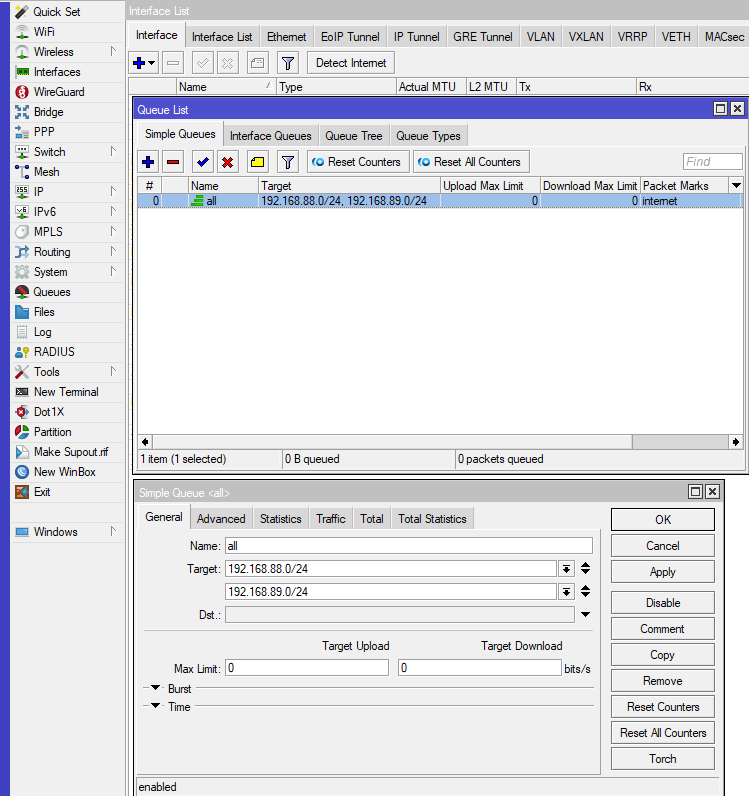 Смысл шейпинга - это добавление в Queues правила ограничения скорости интернета на пользователя. Самое лучшее, что можно сделать использовать для этого Simple Queues (Простые очереди). Вводим сети на которые распространяется шейпинг: