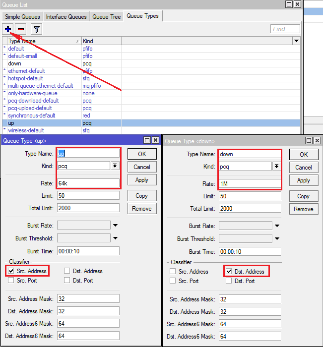 Можно настроить ещё увеличение скорости пользователям, которые неактивно пользуются интернетом. Идём в Queue/Queue Types. Правило down означает, что если последние 10 секунд (Burst time) средняя скорость использования канала интернета пользователем не превысила 512kbps (Burst Trethold) ему предоставляется возможность например открывать странички на 2Mbps (Burst rate). Если пользователь включил закачку на 2Mbps, приблизительно через 2,5 секунды средняя скорость скачки достигнет 512k и скорость уменьшится до 1Mbps (Rate). Тоже самое с исходящим каналом (up):