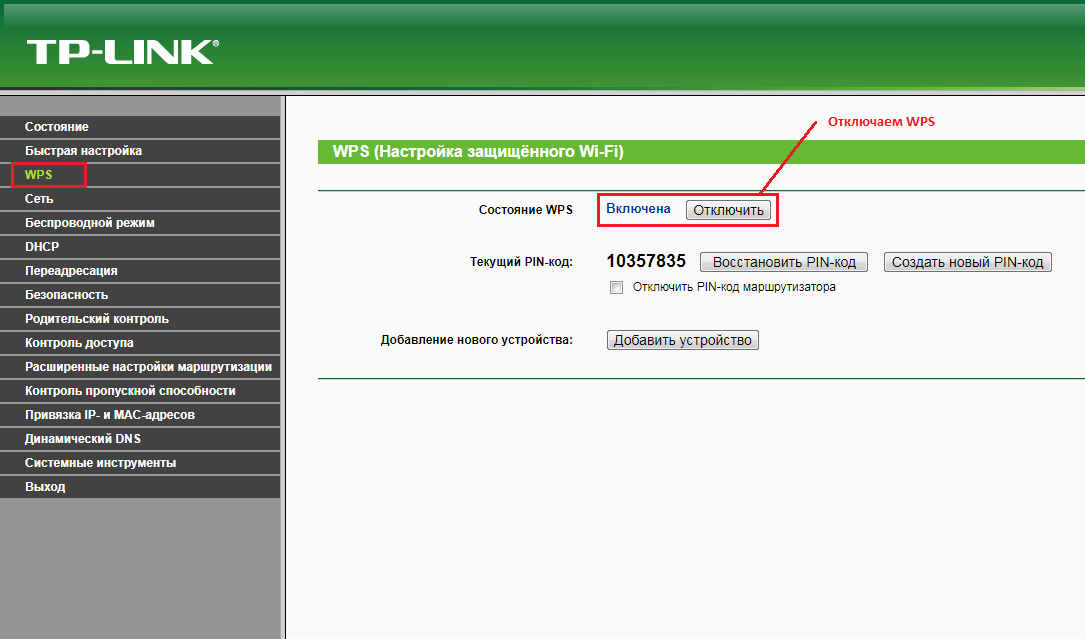 Идём на вкладку WPS и отключаем его. Это защитит сеть от любителей халявного Wi-Fi