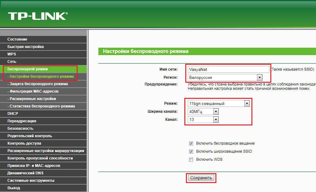 Идём на вкладку Беспроводной режим/Настройка беспроводного режима и называем красиво нашу сеть.